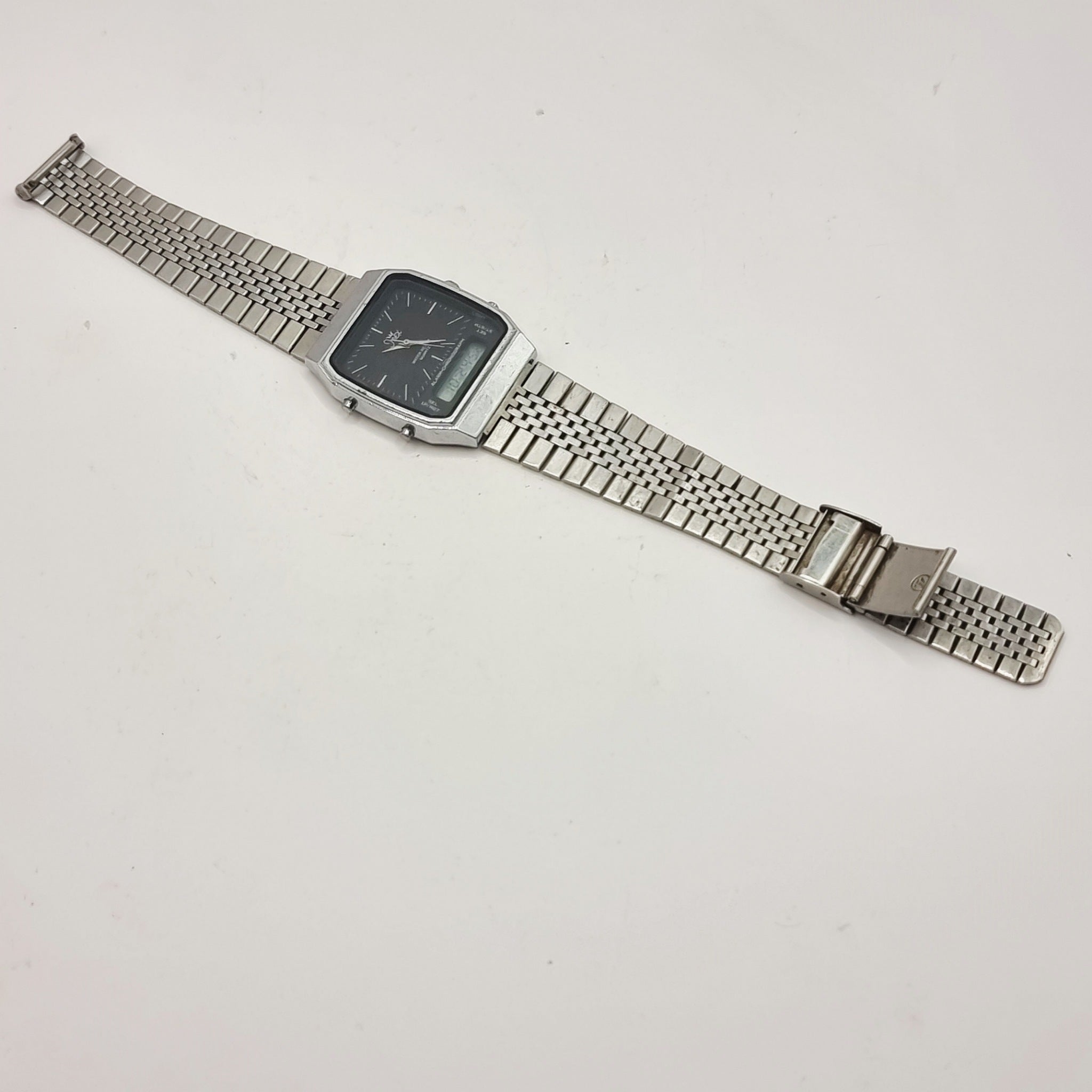 Vintage Inex Alarm Chronograph Quartz Wristwatch Digital Analogue Dual time piece. This Quartz watch features alarm chronograph with both digitaland analogue time. Scuffs to the glass and body of the watch. Showing signs of wear.