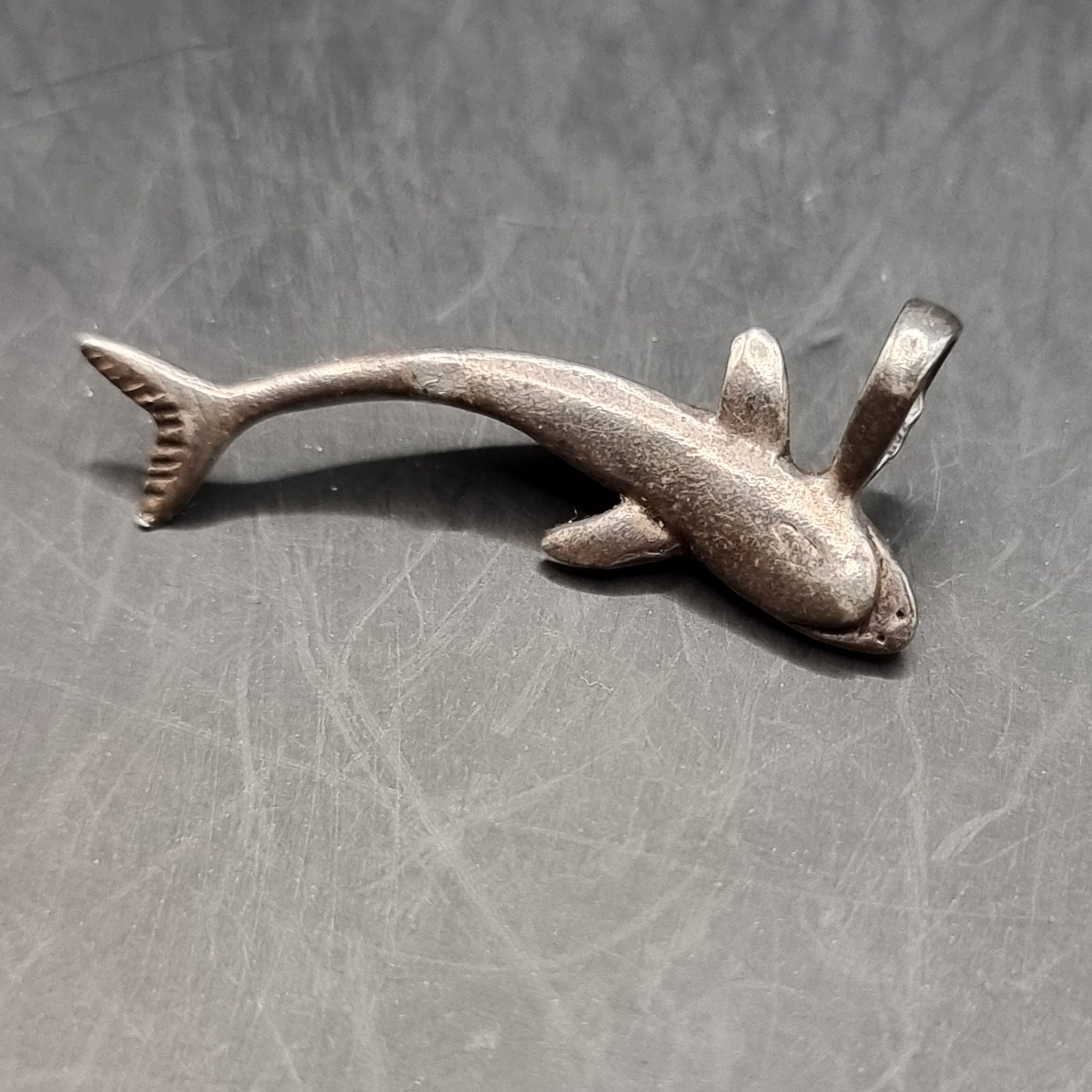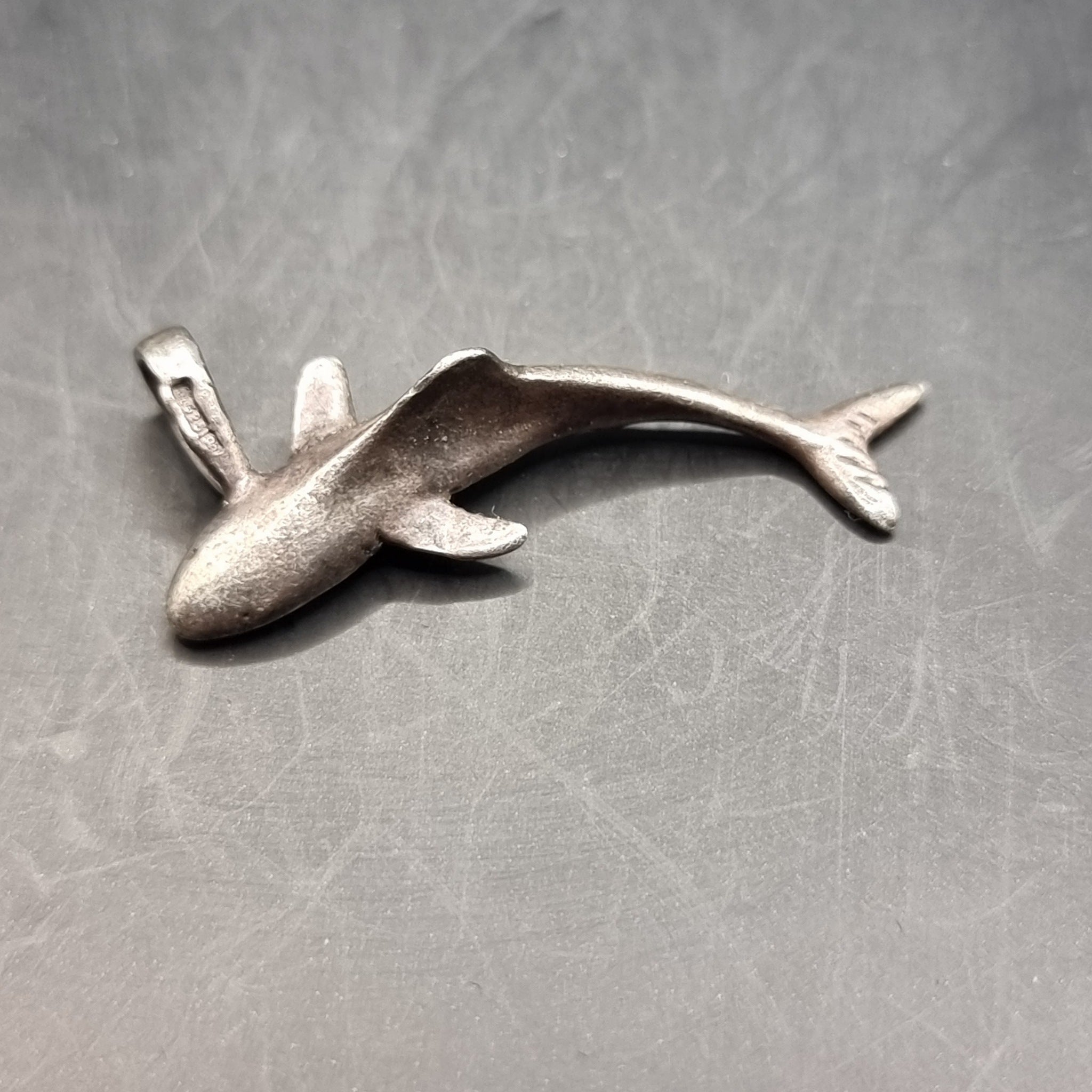 Vintage Shark 925 Silver Pendant. This pendant has the fine features of the sharks mouth, eyes and details to the tail. Hallmarked to the loop. In used but good condition.