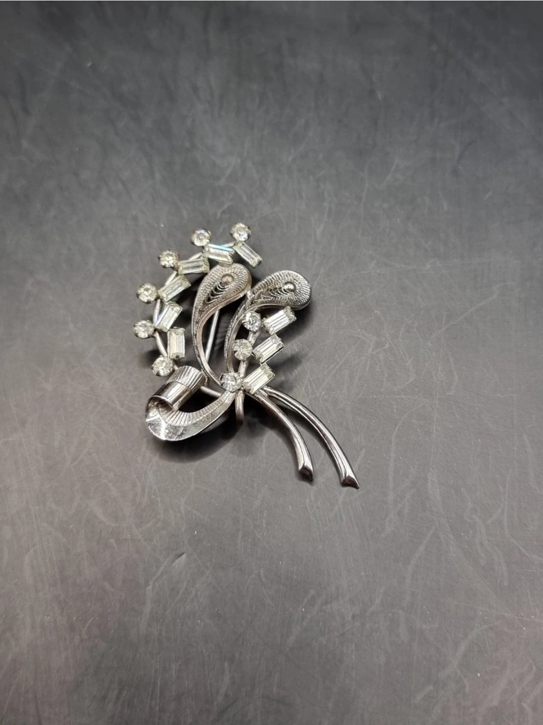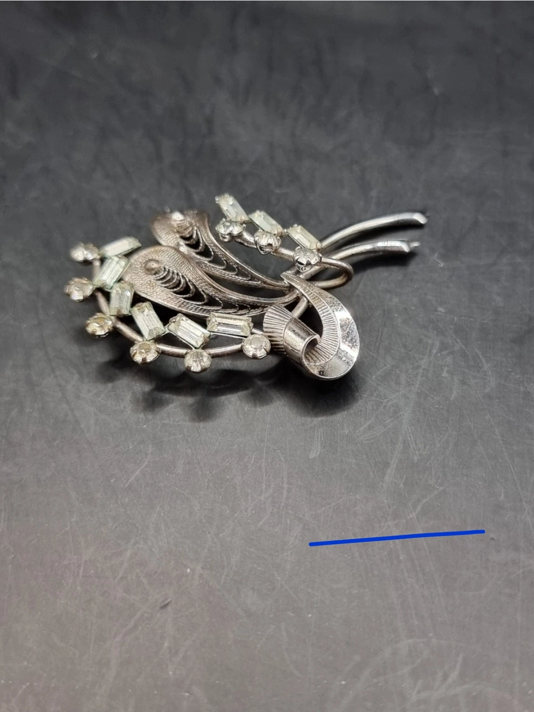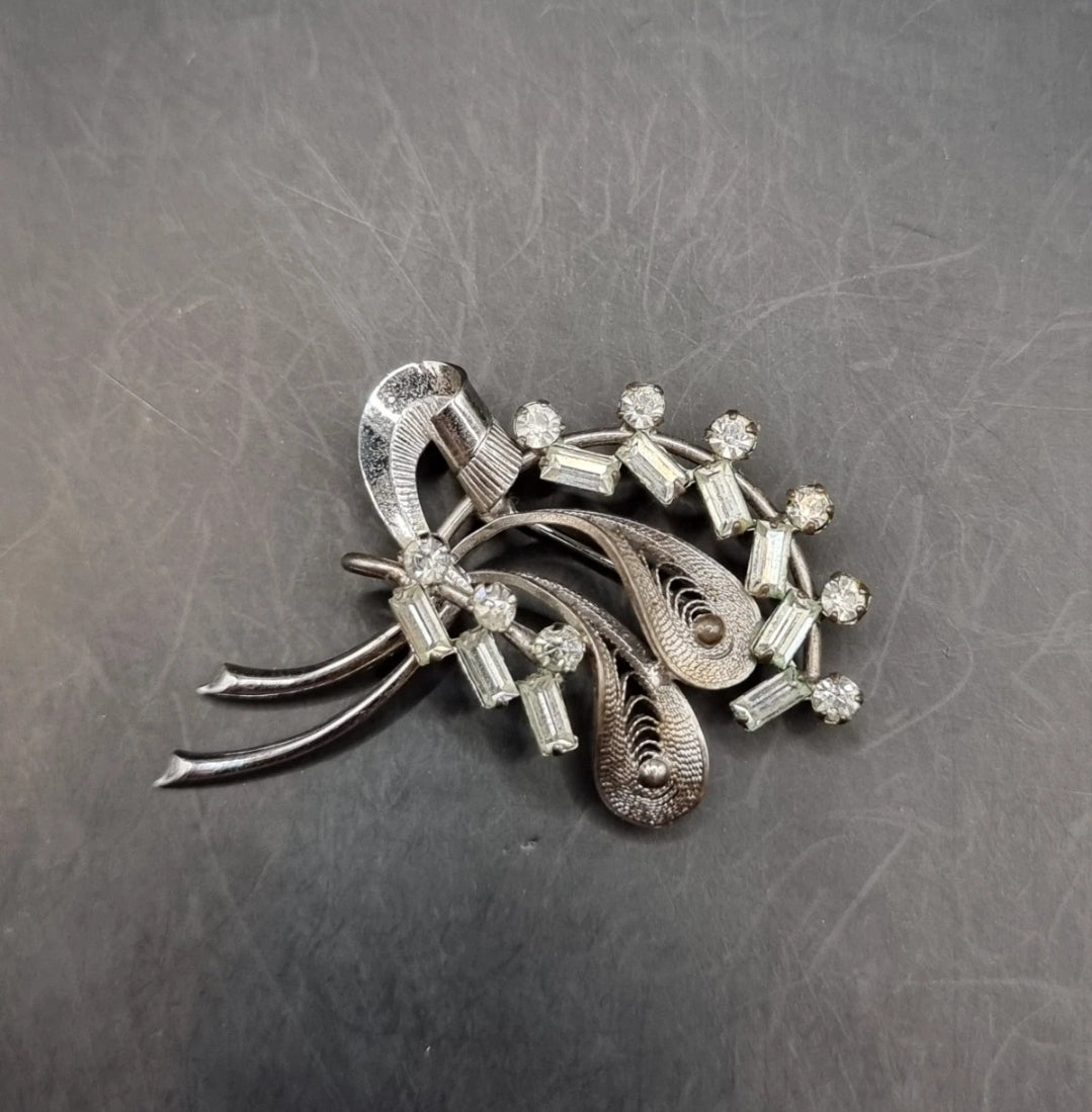 This vintage sterling silver brooch features a beautiful floral design with fitted gems branching off the leaves. The piece is hallmarked and made with 925 sterling silver, with clear paste as the main stone. The elegant silver colour adds a touch of classic beauty to any outfit, while the original design and fine craftsmanship make it a timeless piece of jewellery. Perfect for those who appreciate vintage and antique jewellery items. In good condition could do with a minor clean. Measures: Height 3.1cm, Width 5cm.