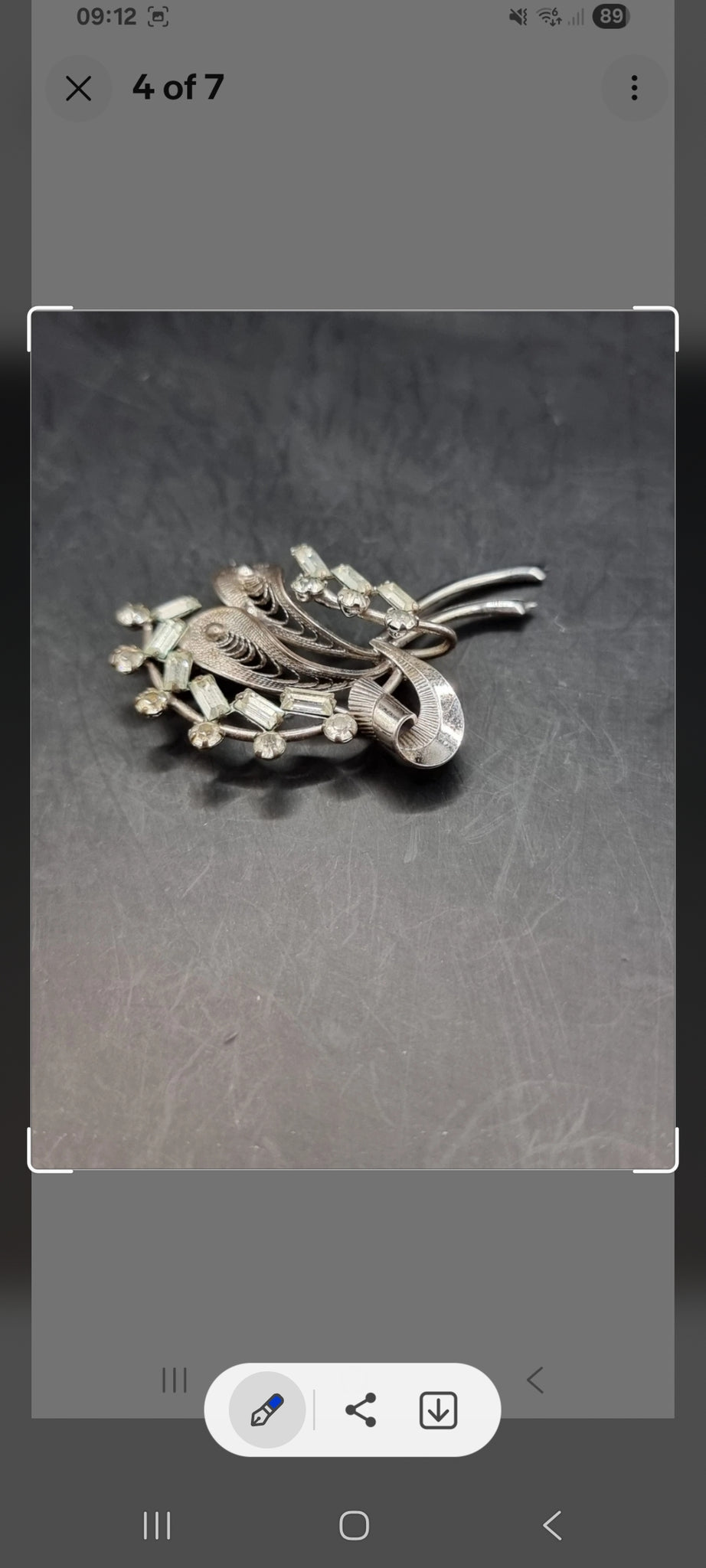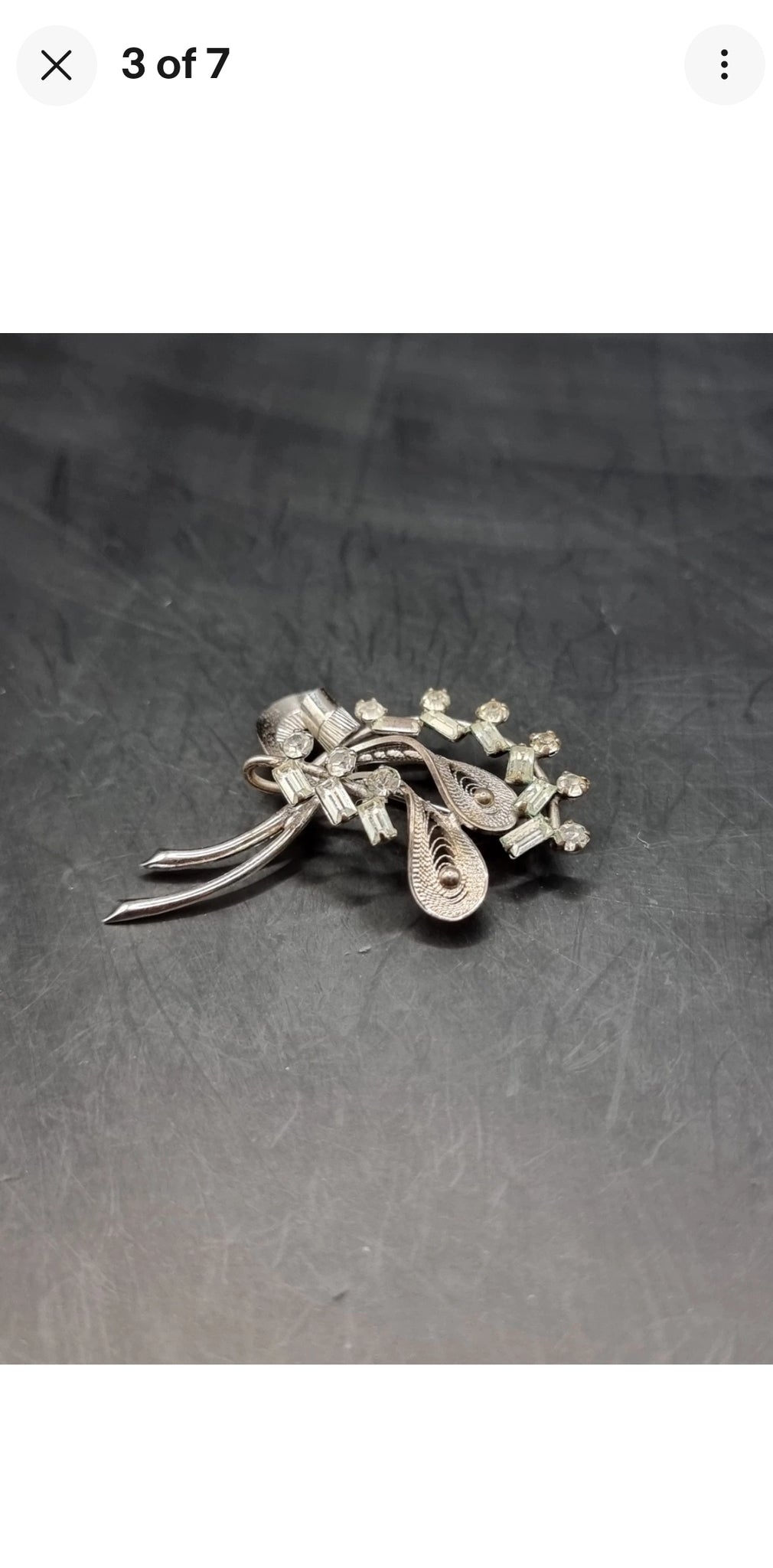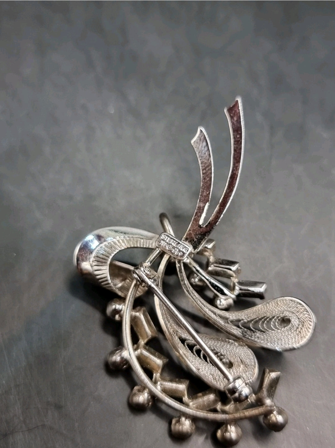 This vintage sterling silver brooch features a beautiful floral design with fitted gems branching off the leaves. The piece is hallmarked and made with 925 sterling silver, with clear paste as the main stone. The elegant silver colour adds a touch of classic beauty to any outfit, while the original design and fine craftsmanship make it a timeless piece of jewellery. Perfect for those who appreciate vintage and antique jewellery items. In good condition could do with a minor clean. Measures: Height 3.1cm, Width 5cm.