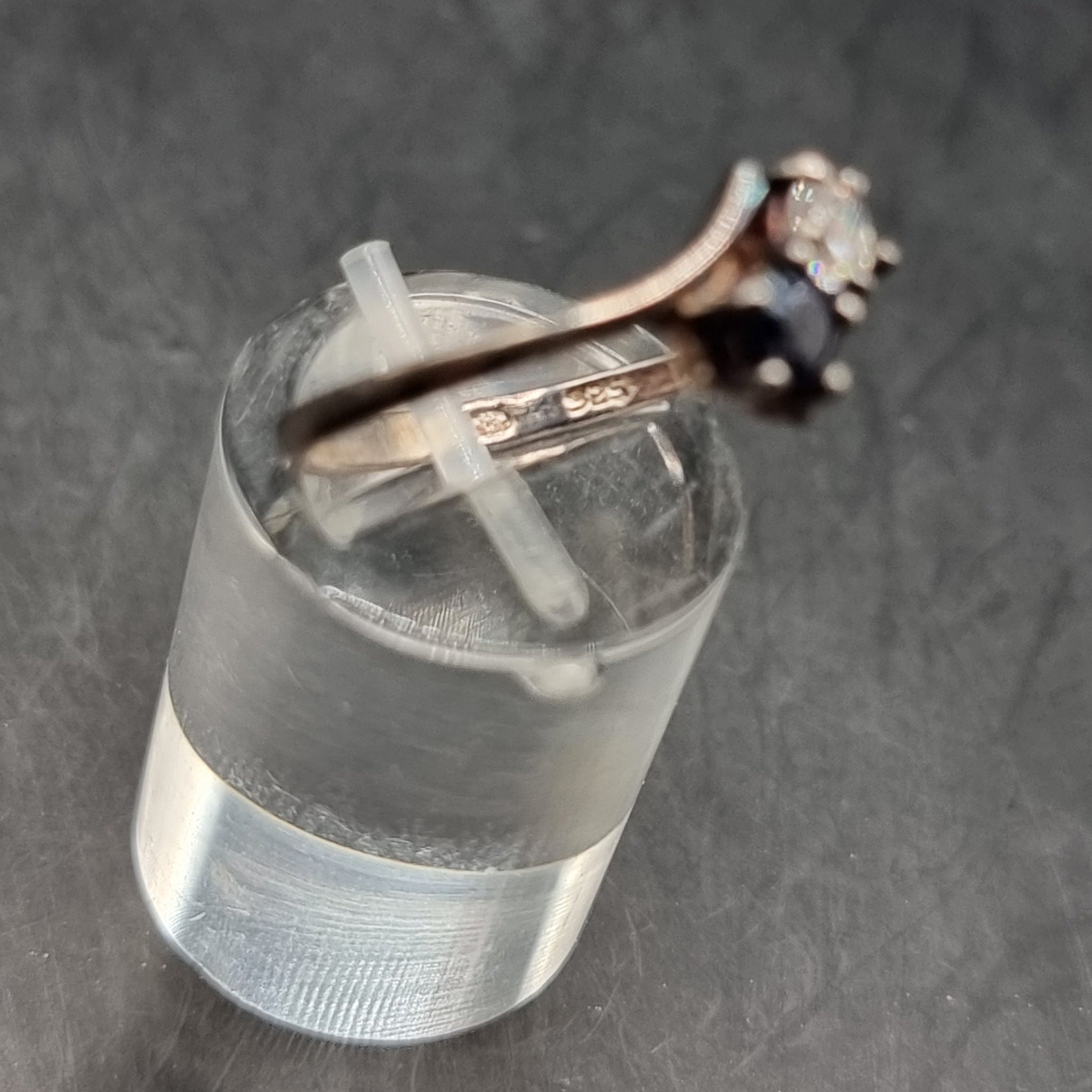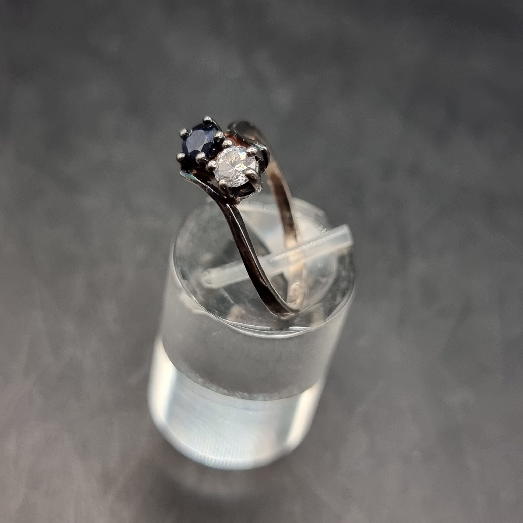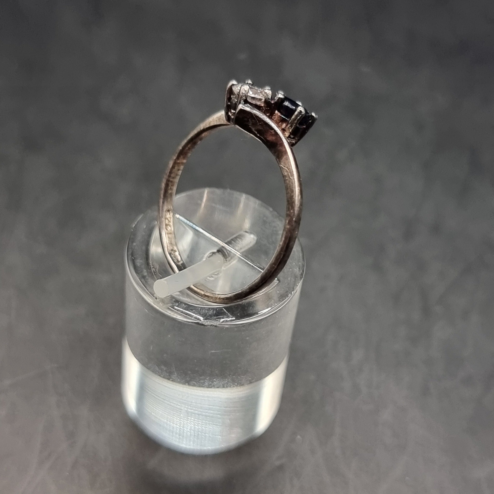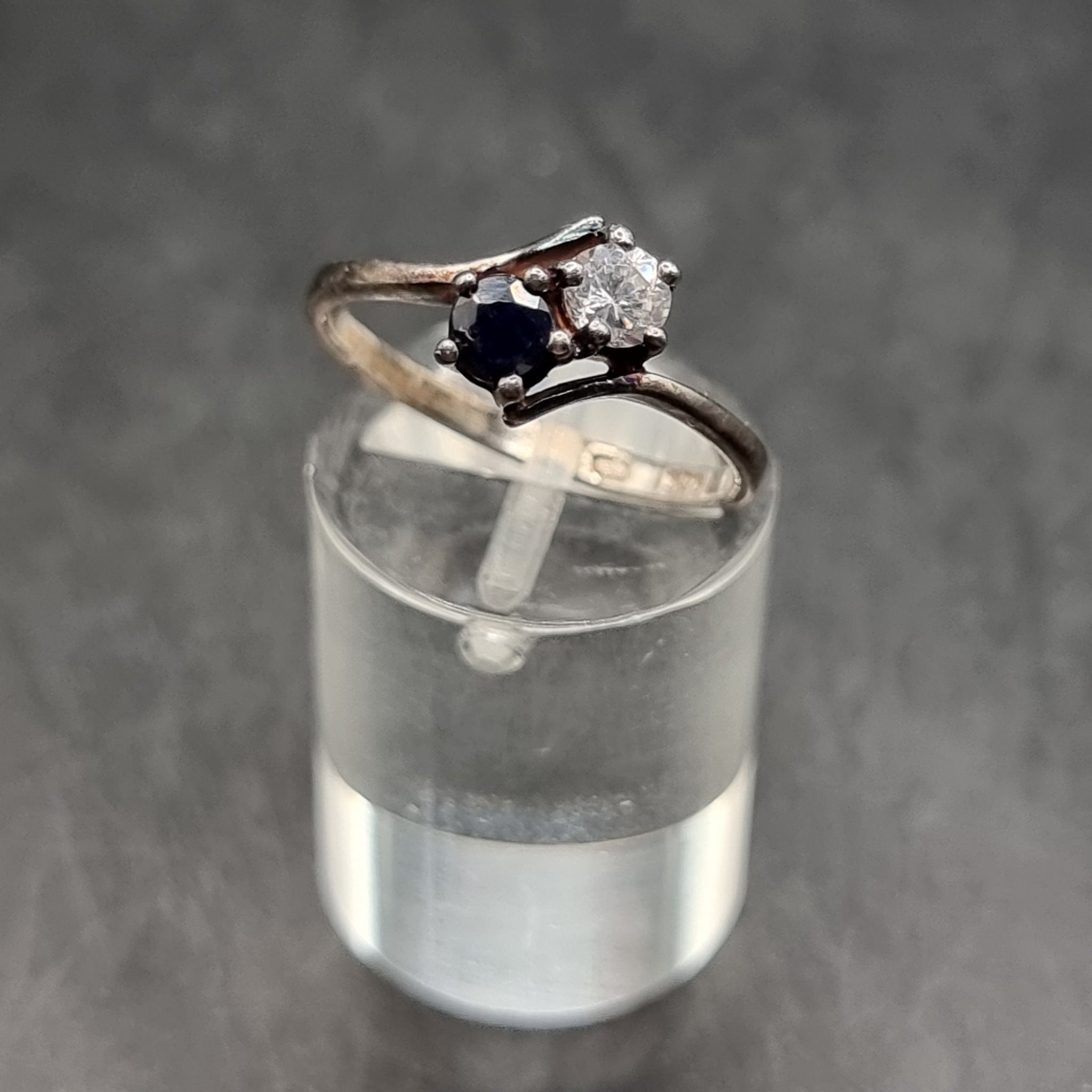 Vintage Two Stone Cross Over Silver Ring. Size 0/M. Meaning this is just over the 0 sizing. The ring has 2 stones fitted one clear and the other purple. Imitating amethyst and diamond. These stones are made of paste. Would make a great affordable engagement ring. In used worn condition. Weighs 1.8g.